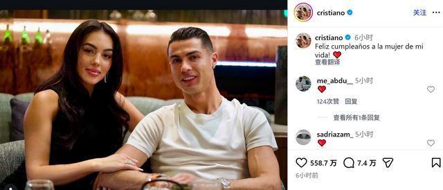 C罗在社交平台上晒出了与乔治娜的亲密合影,并配文写道:“祝我生命中最爱的女人生日快乐!❤️”
